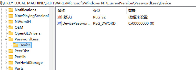 HKEY_LOCAL_MACHINE\SOFTWARE\Microsoft\Windows NT\CurrentVersion\PasswordLess\Device。 - 確認右側視窗中的